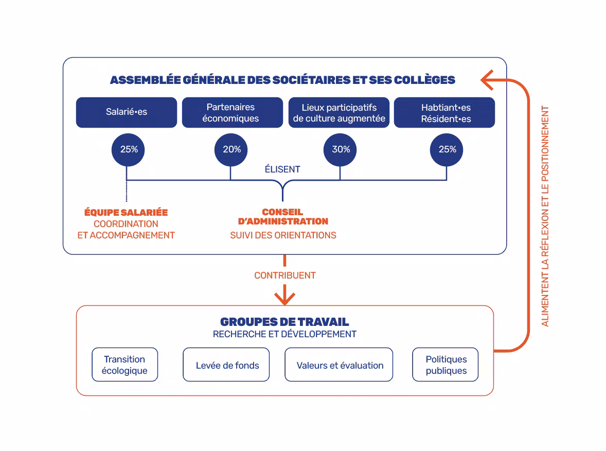 La Société coopérative d’intérêt collectif (SCIC) est créée en novembre 2018 pour imaginer et préfigurer un outil foncier unique, dédié au secteur culturel et artistique. Ce modèle d’entreprise, fondé sur une idée de transformation sociale, de solidarité et de transparence, associe obligatoirement autour du projet des acteur·ices salarié·es, des acteur·ices bénéficiaires et des contributeur·ices, se mobilisant ensemble au profit d’un territoire. À terme, un montage de plusieurs structures juridiques assurera la gestion d’un ensemble immobilier commun.